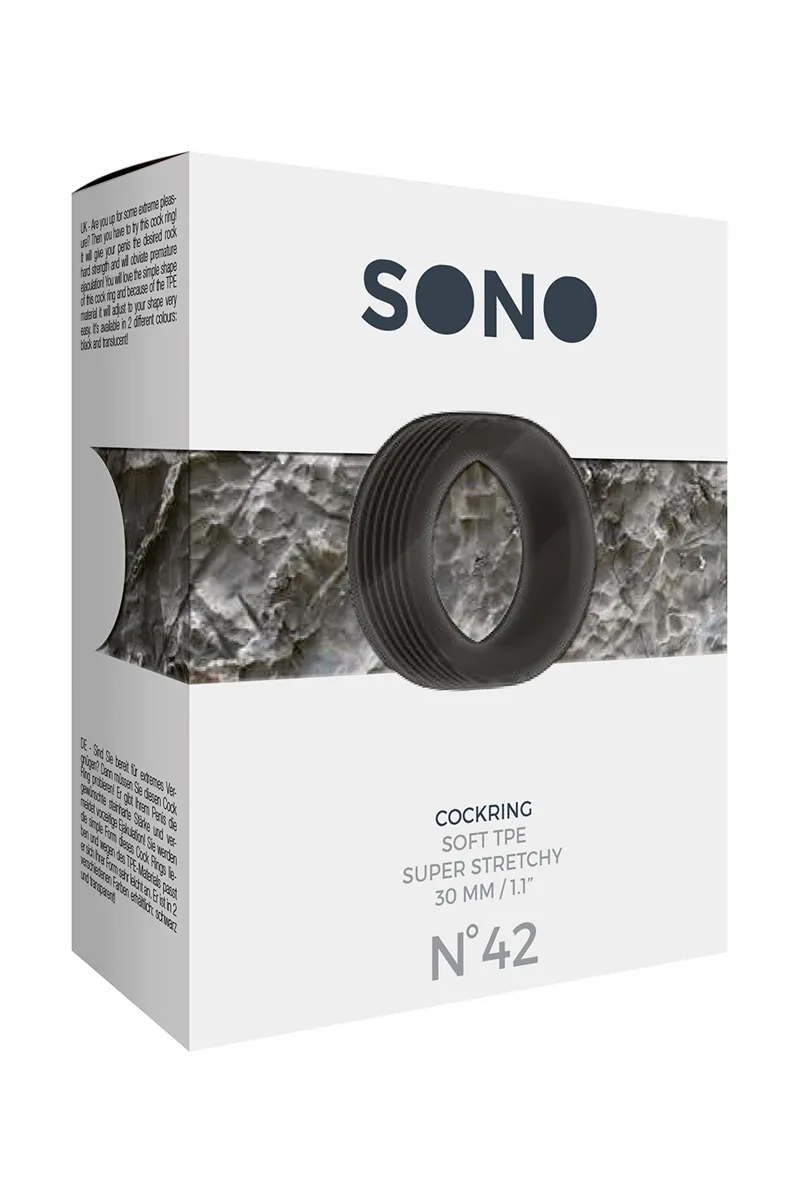 Pour les amateurs de cockrings et de sensations, la marque SONO propose son anneau de pénis n°42, en TPE noir hyper extensible.